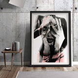 The strong and powerful curves of the female form is flanked by a hand-painted canvas artwork imagery, allowing the texture of paint brush strokes and drips to show themselves. Hang it individually as a statement piece or with other Art Prints in this series.